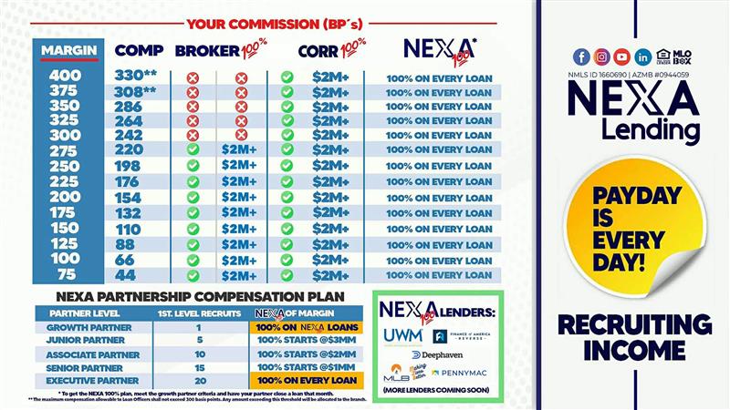 You start out at the highest comp plan of 220BPS and can earn up to 275BPS + residual income. Obviously, in some markets to be competitive youβll voluntarily lower that. And as a thank you for helping NEXA grow should you decide to get into it, you become a partner and get a 100% commission split. Hereβs the chart: